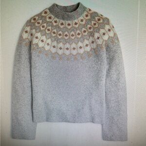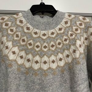 J CREW MERCANTILE FAIR ISLE SHIMMER SWEATER SIZE MEDIUM. Grey with Gold and White design. Extra soft with long sleeves and round neckline. Made of 55% Acrylic 36% Polyamide 7% Wool 3% Elastane. Measures 24” shoulders to hem 19 1/2” armpit to armp unstretched. NWT!