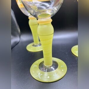 Vintage handblown hand painted 1970’s colors fruit pattern long stem glasses .