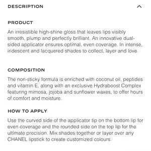 An irresistible high-shine gloss that leaves lips visibly smooth, plump and perfectly brilliant. An innovative dual-sided applicator ensures optimal, even coverage. In intense, iridescent and lacquered shades to collect, layer and love.
