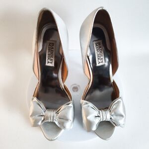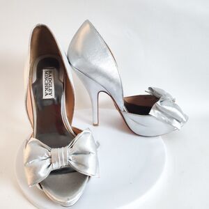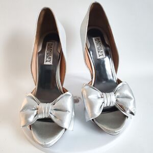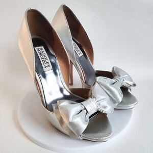 Badgely Mischka D'Orsay Formal Silver Leather Sole Open Toe Bow Heels 6.5 Pumps