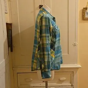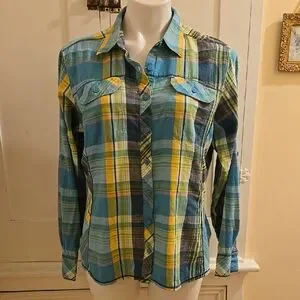 This classic cotton button down shirt has a multi colored plaid print in greens, yellows and grays It has the classic design features: tapered hem, adjustable sleeves and button front. This top also features 2 button down breast pockets.