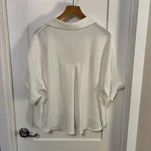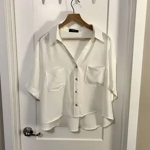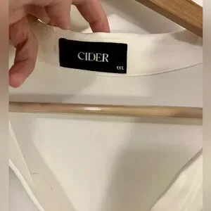 This shirt is from CIDER. It’s a really nice quality shirt not too flimsy but very flowy and relaxed. It’s cropped, but it’s not too short. Has sort of a high low hemline where it’s longer and back.
