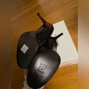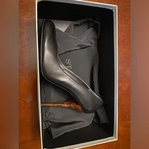 St. John black leather round toe heels with wood grain heel womens shoes size 8