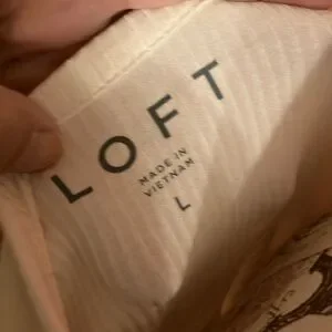 LOFT. Thisis a short sleeve ribbed top with three buttons down the front of the V-neck. It is a size large. Laying flat, the pit to pit measures 17 1/2 inches. But you have to remember, there is a ton of stretch to this top. I usually wear a large and this top fits me perfectly. It is gathered at the top of the shoulders, which gives it a dressier appearance. It is brand new with the tags. It is cream colored. The material is very very nice, and it is very very soft. It feels really good against your skin. NWT
