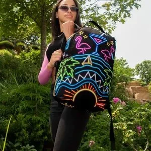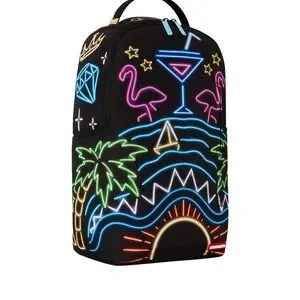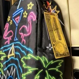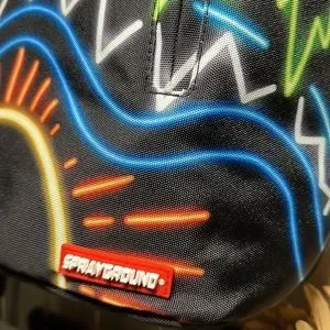 Dimensions: 18" x 6" x 11.5" • Front zipper pocket • Side pockets • Zippered Stash pocket • Separate velour sunglass compartment • Ergonomic mesh back padding • Adjustable Straps for custom sizing • Gold zippers with metal hardware • Metal "Sprayground Authentic" badge • Slide through back sleeve connects to carry-on luggage to free your hands