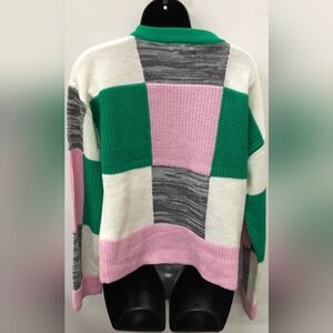 Stay cozy and stylish with this colorful patchwork women's sweater. Featuring a vibrant mix of green, pink, white, and gray, this sweater is perfect for adding a pop of color to your wardrobe.