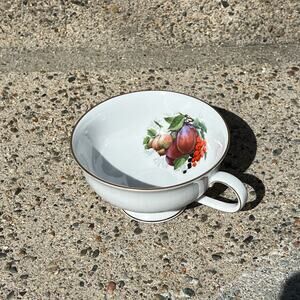 How cute is this cup and saucer featuring trendy fruits such as pear, orange, and grapes. gold rim. excellent condition!
