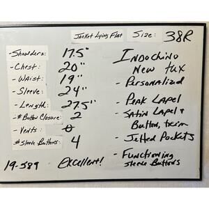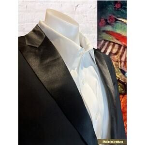 Style: 2-Button, No Vent, Satin Lapel and Buttons, Jetted Pockets