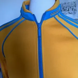 Vintage Adidas Woman's Jacket in yellow with blue trim.
