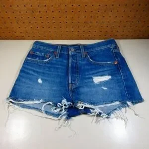 Levis womens dark wash rawhem distressed buttonfly jean shorts 26 EUC