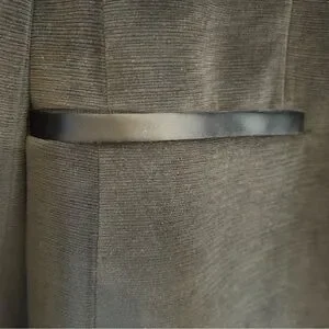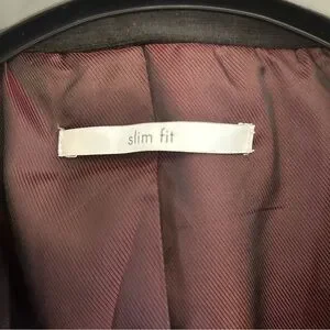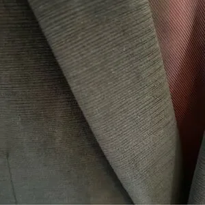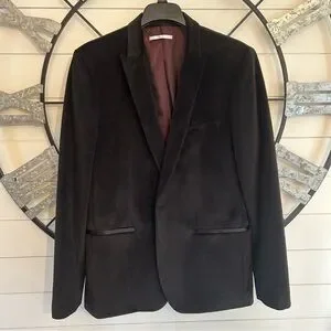 This is like a light textured velvet. I don’t think it is actual velvet. This makes it more up to date in my opinion. It is a medium however there is no tag. My son wore this once and has since bulked up at the gym so it’s tight on under arm area. Pristine condition. Single breasted slim cut. Front pockets still stitched together. Very versatile. Pocket trim is satin.