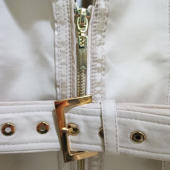 White House Black Market Beautiful Light Taupe Moto Jacket Satin Ribbon Detail Belted. This is a great blazer/jacket with gold buttons and grosgrain ribbon & satin pleated details as shown. A very unique jacket that is in very good condition. The fabric has stretch so you can add a little bit to the measurements. The sleeves are slightly longer than 3/4". There are thin white soft shoulder pads that can be removed and there is just a hint of discoloration to the pads but this should come out in another hand wash.