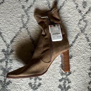 NWT Zara taupe faux suede 3.5” heel socks ankle booties.