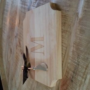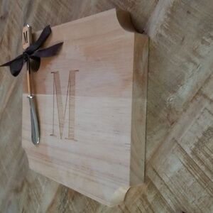 Mud Pie Wood Serving Boatd & Spreader with “M” Monogram. Nicely presented with brown grosgrain ribbon. New unused condition.