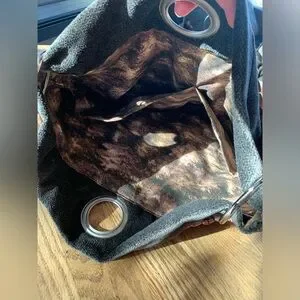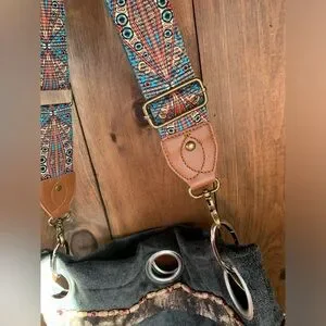 Made of upholstery weight fabric this bag is fully lined and has large grommets, hand beading, feathers, two inside pockets, and an adjustable strap.