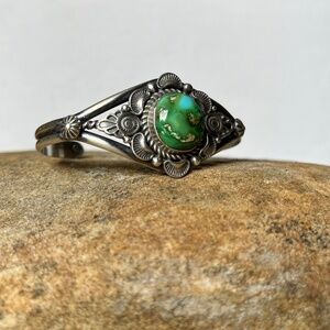 Offering a lovely sterling silver & Sonoran gold turquoise cuff bracelet made by Navajo artist Robert Shakey.