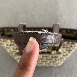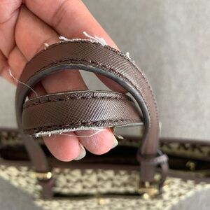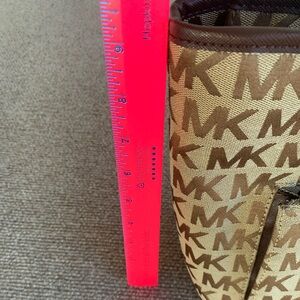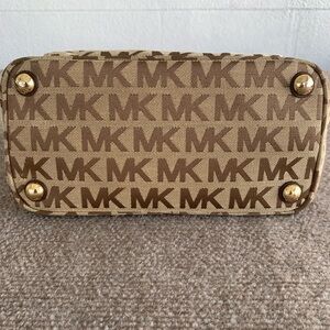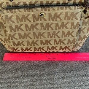 The bag is pre-loved and in good used condition. Features the MK logo in brown with tan background, handles are brown, is a canvas material . The bag is very clean inside and out. Has multiple compartments and 6 card holder slot in front pocket. Hardware is in good condition and zipper/snap closure work appropriately. Has some wear and fraying of the top handle straps (depicted in the photos).