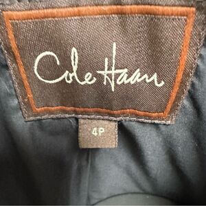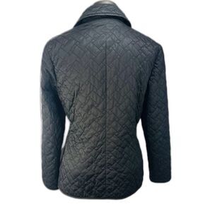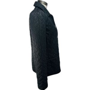 Cole Haan Thermore Eco Down Insulation Womens Quilted Short Coat in Black. The outer shell material is made of durable polyester, featuring a quilted pattern for a fashionable touch. The jacket/coat length is short and has a zip and snap closure. Size 4P Petite.
