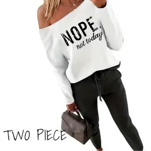 Black draw string pants and a white off the shoulder sweatshirt that says NOPE not today. Perfect to lounge in on a cold day or to spice up any outfit!! # casual #NOPE #nopenottoday #trendy #trending #twopiece #sweatshirt #offtheshoulder #sweater #stretch #stretchy #beachchick00 #shopmycloset