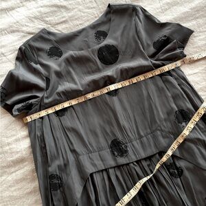 Slightly unstructured and loose dress. Deep gray with large black mod dots. There is no content tag or brand inside, but it feels like silk or a silk blend to me…very soft and comfortable. Fully lined. Appears new without tags. I don’t think it’s ever been worn.