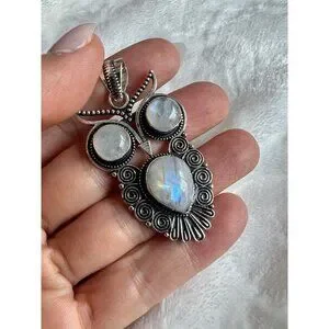 925 OWL Spirit Guide Rainbow Flash Moonstone Pendant Necklace