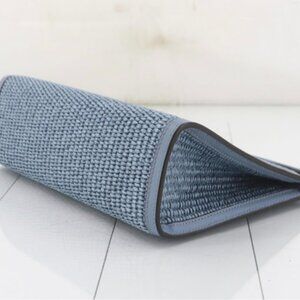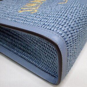 Varenne woven pouch from JIMMY CHOO featuring light blue, raffia, interwoven design, embroidered logo, open top, main compartment, internal slip pocket and full lining. Magnetic closure.