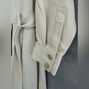 Size XS this is slightly oversized to be belted and blousy. Actual waist measures 16” across lay flat, total length from shoulder to hem is 56” and sleeve is 22” long. This may be better suited for someone 5’6 and taller as its proportions are elongated. Incredible chic piece - super well-made. This retail was $300