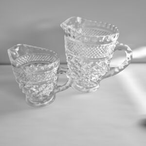 2 pitcher, creamer set. Wexford clear Anchor Hocking creamers/pitchers. All measurements are approximate measurements: Small pitcher holds 1 cup liquid. The large pitcher holds 2 cups. No chips No cracks. Good condition.