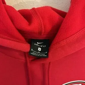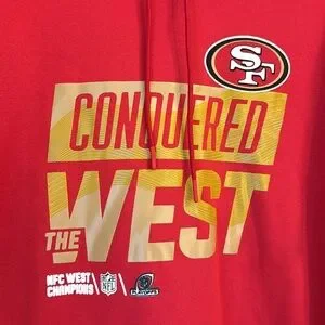 Long sleeve red hoodie from Nike. San Francisco 49ers gold "Conquered The West" logo on the front. NFC West Champions