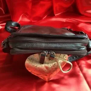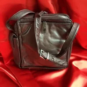 Vintage leather Perlina New York crossbody bag that is fully loaded. This thing has pockets inside of pockets, credit card slots, dividers, zipper pockets, exterior pockets, and slip pockets. Dark rich leather with patina. Good used condition. Dark hardware.