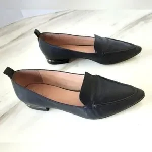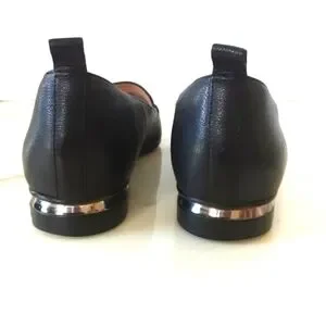 FRANCO SARTO Susie Soft Grain Leather Silver Accent Heel Pointed Toe Flats. Crafted from genuine soft grain leather and lined with fabric and leather, these loafers are perfect for all seasons - from winter to summer. The pointed toe shape and metal heel accent adds a touch of sophistication, and is ideal for anyone looking for a stylish and comfortable shoe that can be worn for any casual occasion.