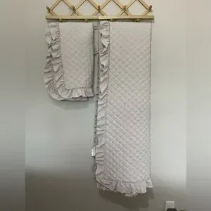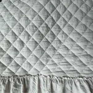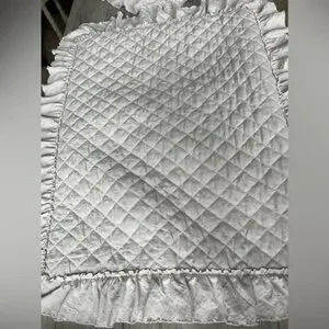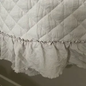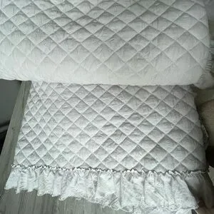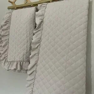 Shabby Chic Queen Quilt withh 2 Queen Pillow Shams has an intentional faded & distressed look adding vintagee charm to your bedroom. Taupe/Grey Light weight and soft. Ruffle goes all the way around the quilt and shams. Has a little piling in a few areas. Used in a guest room, & in excellent condition.