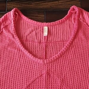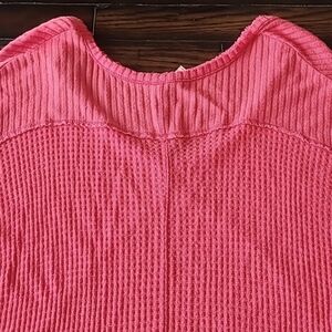 This is a Free People coral Sunset Park v-neck waffle knit thermal tunic length top in great condition. It has some light visible wear and a few small pulls on the back.