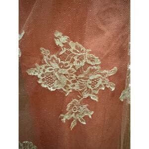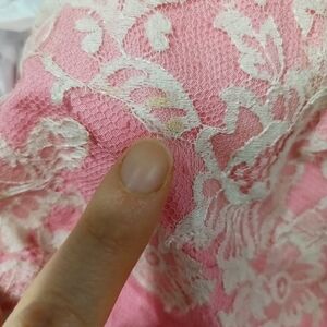 What a stunning dress pink & white lace and pink polka dot netting overlay. 2 layers of netting on skirt. Unfortunately, no brand tag or sizing looks to me as if it was handmade. All the lace is hand stitched on, back zipper closing an eye hook.