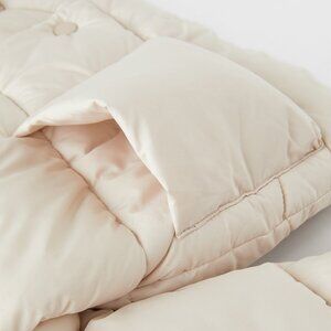 Quilted coat with hood, long sleeves, and rib cuffs.