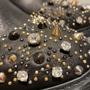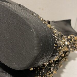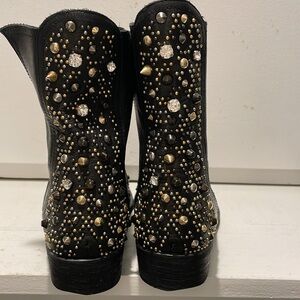 Zara black ankle boots are leather with studs that are black, gold snd silver. Has some stones that look like diamonds, cushioned insoles, rubber soles . Size 36 Eu, 6 US . Slip on, see photos for two wear spots on back of heels .