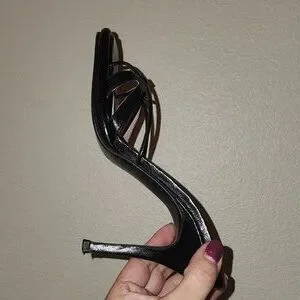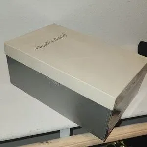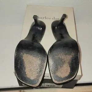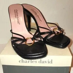 Original vintage charles david square toe leather heelss with gold ring. slightly worn, small scratches on stiletto heel, comes in original box.
