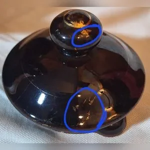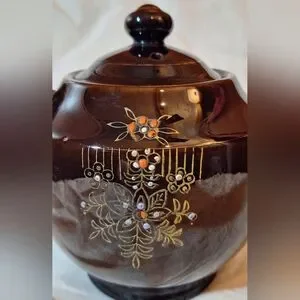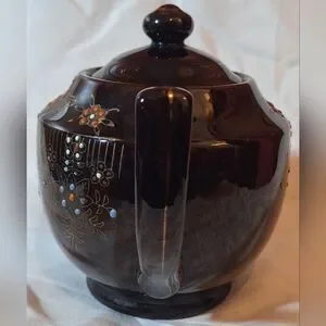 Vintage 1940's Japanese teapot. Brown with intricately painted floral and leaf design. Gold-tone accents. It is in good vintage condition; it does have a few spots where the gold-tone paint has worn off, scratches here and there. It does have what I believe are factory defects where the gold-tone paint is smeared on lid, see photo. It also has cracks in the bottom and on the side, see photo. Approximately 6" tall × 8" wide.