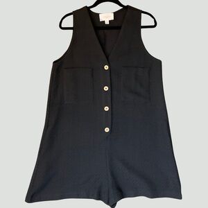 “Effortlessly chic, this one-piece is perfect for anything and everything! From brunches and get togethers to happy hours and vacations, this easy yet elevated style has you covered. The Black Myla Romper features two front pockets at the chest, gold button detailing for some extra shine, and a textured fabric to create cool contrast. Pair with glitzy flats and bold accessories for glamorous dinners on your next getaway!”