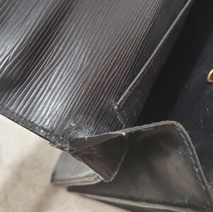 Exterior call-outs as depicted in pictures. Corner wear on bottom of bag on both corners. Interior is in good condition despite rear pocket needs extra cleaning - dry peeling. Small tear on side of bag at the top. Biggest call-out is bag is ripped at top on other side and is currently being repaired by duct tape. This is how it was when purchased. Epi leather is in good condition and front lock/snap works. See pictures.