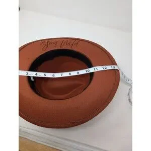 Floral lady is imprinted on the side of the hat. "stay wild" is on the bottom rim. There is one small stain/spot on bottom rim, please see photo. Color is a really pretty modern rusty red orange. Very unique!