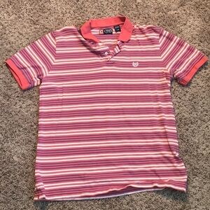 Pink (wife says coral, but I think it is more pink) white, and blue striped polo. Great condition, smoke free home