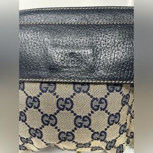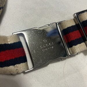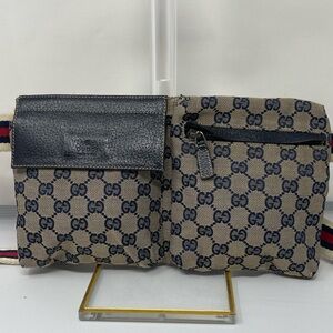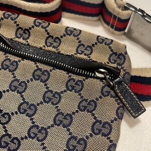 Unique Gucci belt bag with red blue and off-white strap. silver buckle is shiny and strapped is well intact. No stains or tears.. Excellent corners for age. No peeling on leather and zipper and Velcro work great!. Authenticated and purchased from bagriculture