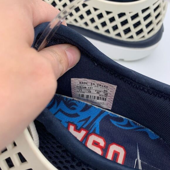 These pre-owned shoes are in good used condition. Mild yellowing occurs on some parts of the shoes, and slight scuffing on the blue toes.