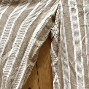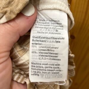 Linen Blend, smocked waist, pull-on style. Tie at waist can cinch in waistband if desired. Front slant pockets.