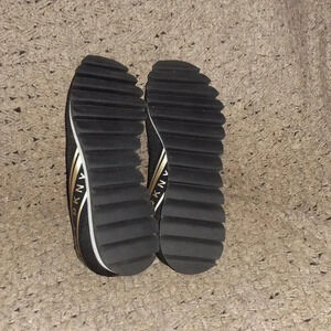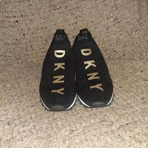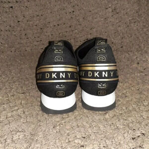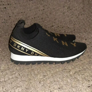 DKNY-Abbi Pull On Sock Sneaker-Air Knit-Black/White/Gold-Sz 9.5-Near Mint