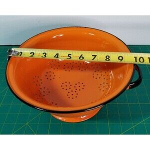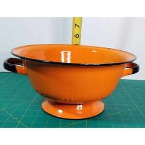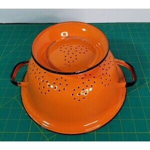 Vintage 1960s Huta Silesia Orange Colander Enamelware Strainer Black Trim
