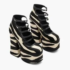 Black tan zebra print Kiki shoes by Marc Jacobs. Strappy front buckle closure, chunky heel, platform silhouette, zebra print calf hair. Sold out style.