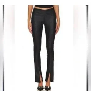 Features: Pull-on style, back pockets, wide waistband, raised seam detail, skinny legs with slits at both hems