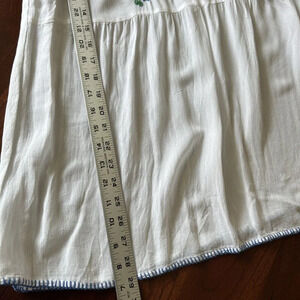 This Anthropologie Chloe Oliver tunic top is a must-have for any bohemian-inspired wardrobe. The white blouse features intricate embroidery and a collarless V-neckline, making it perfect for both casual and business occasions. The sleeveless design and lightweight fabric make it ideal for summer and spring, while the pullover closure ensures easy wear. The blouse is made of rayon and is machine washable for easy care. The classic fit and woven fabric type make it a versatile addition to any wardrobe. The top is perfect for travel, and its designer, flowy, bohemian, and folk themes make it a unique piece.